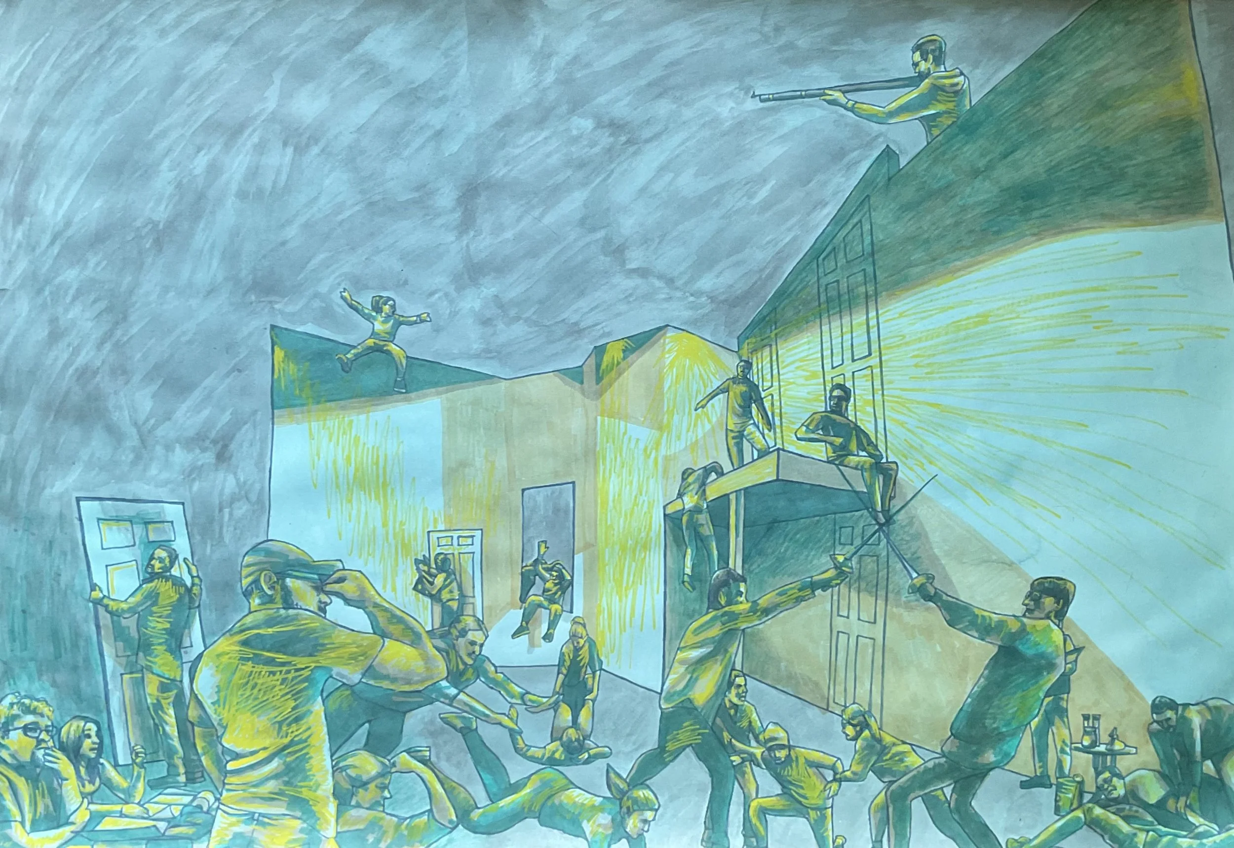 ”My vision for this project is to produce a body of works that are united by the celebration and appreciation of the arts in Plattsburgh that also share a visual language. Stylistically, my work heavily relies on the use of arbitrary color, expressive mark making, and warping the space to capture the feeling of the subject matter rather than just a likeness of it. My work showcases a variety of expressive techniques like use of impasto, allowing media to drip down the composition, and even warping ink drawings with isopropyl alcohol. Beyond the obvious primary theme of the arts in Plattsburgh, an underlying theme of diversity is present in both the variety of artworks and artists celebrated. I would like to further draw on this secondary theme by focusing on depicting fellow LGBT+ individuals in the portraiture section of the project. There is a long history of artworks that draw on other works for inspiration. In fact, some of the most celebrated and studied works are in direct conversation with other artwork. By building on this tradition with the arts within Plattsburgh as the basis, I will build a space for my hometown in the art history canon. By doing so I hope to not only shine a spotlight onto the massive amount of skill and talent from the area, but to also encourage other artists to engage with Plattsburgh’s arts scene in a similar manner.”