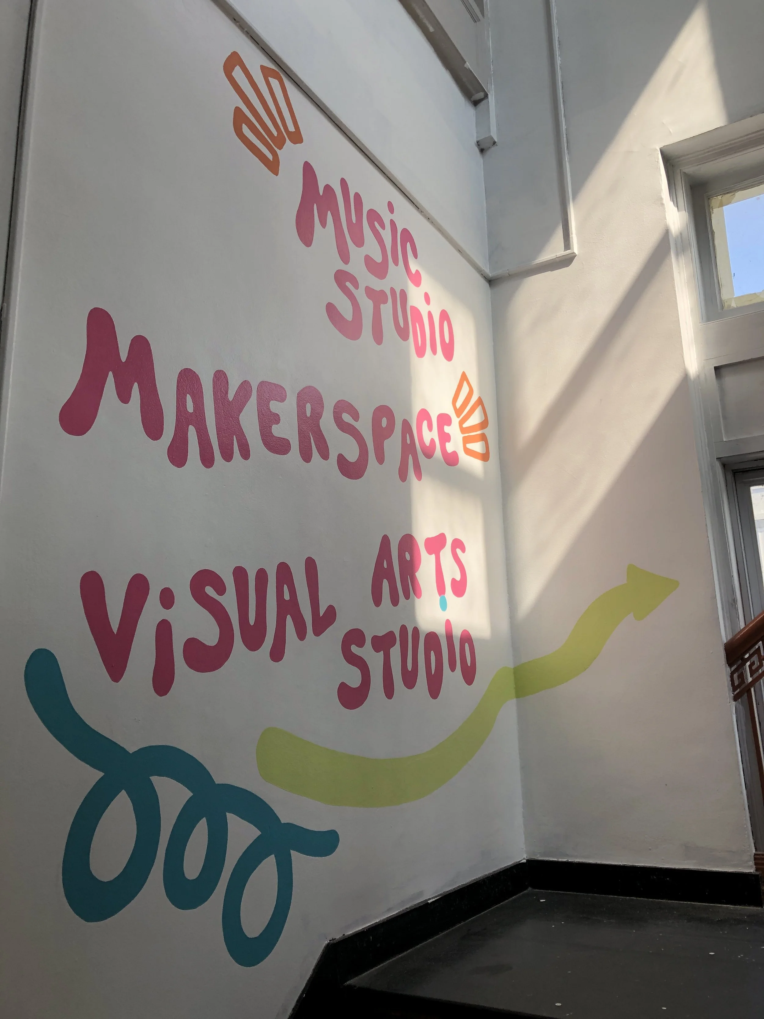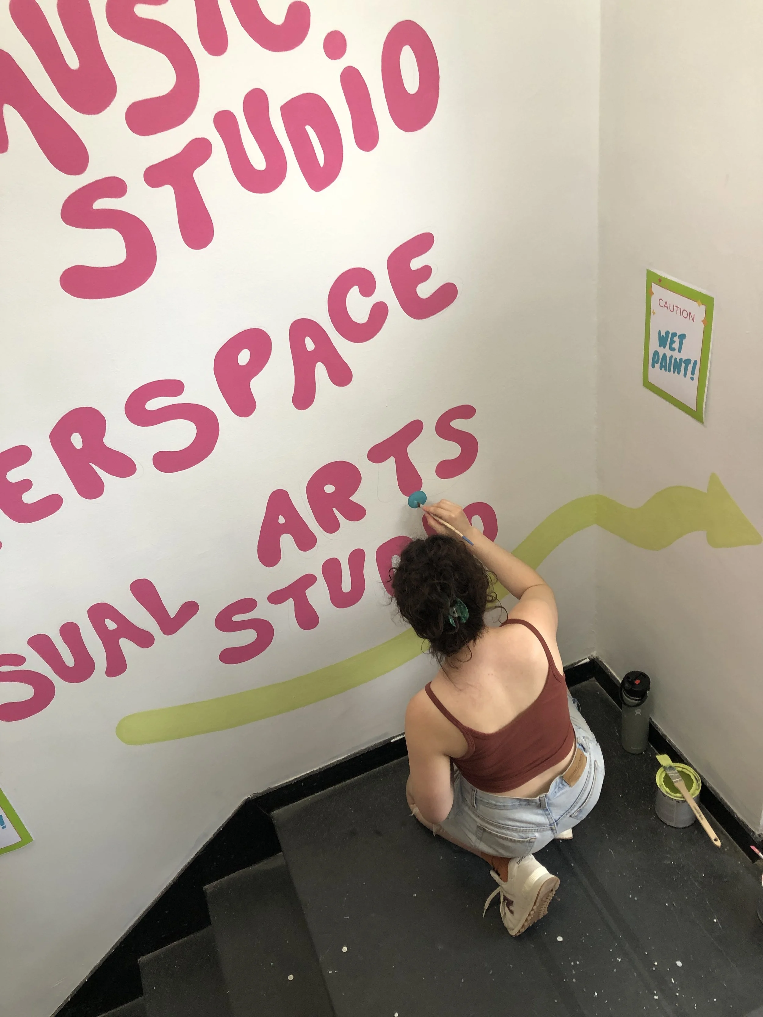 I began painting murals at the Strand because I was tired of looking at boring concrete block walls in the basement where the Clay Studio is. After painting that hallway, Megan and I started brainstorming wayfinding ideas for our building, an old building made up of hallways and twists and turns. The wayfinding project prioritized creating a welcoming space with clear directions to find your way around. I was also tasked with beginning a mural, using our driving phrase, “Art is for Everyone” as a starting point for a mural painting summer camp. The kiddos then took that concept and ran with it, filling out the rest of the wall.