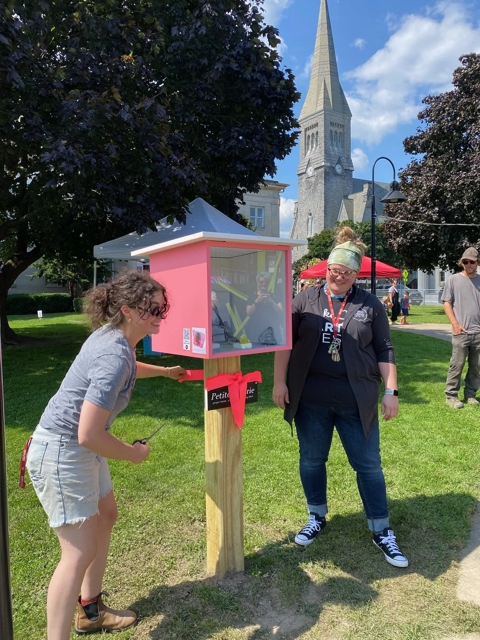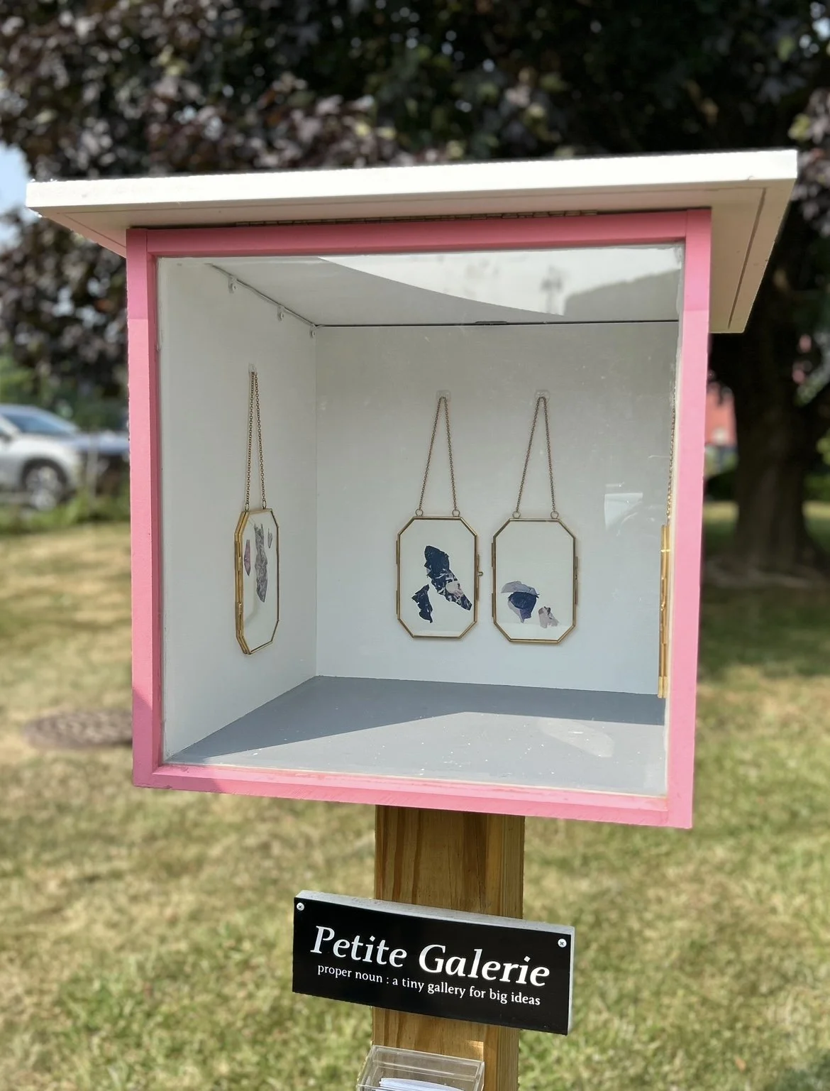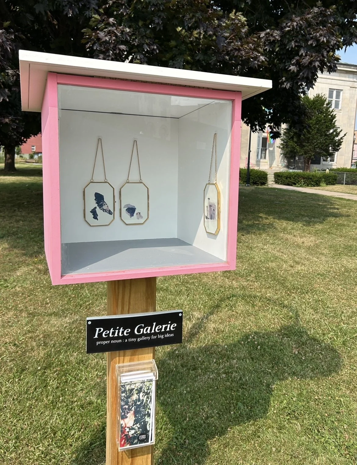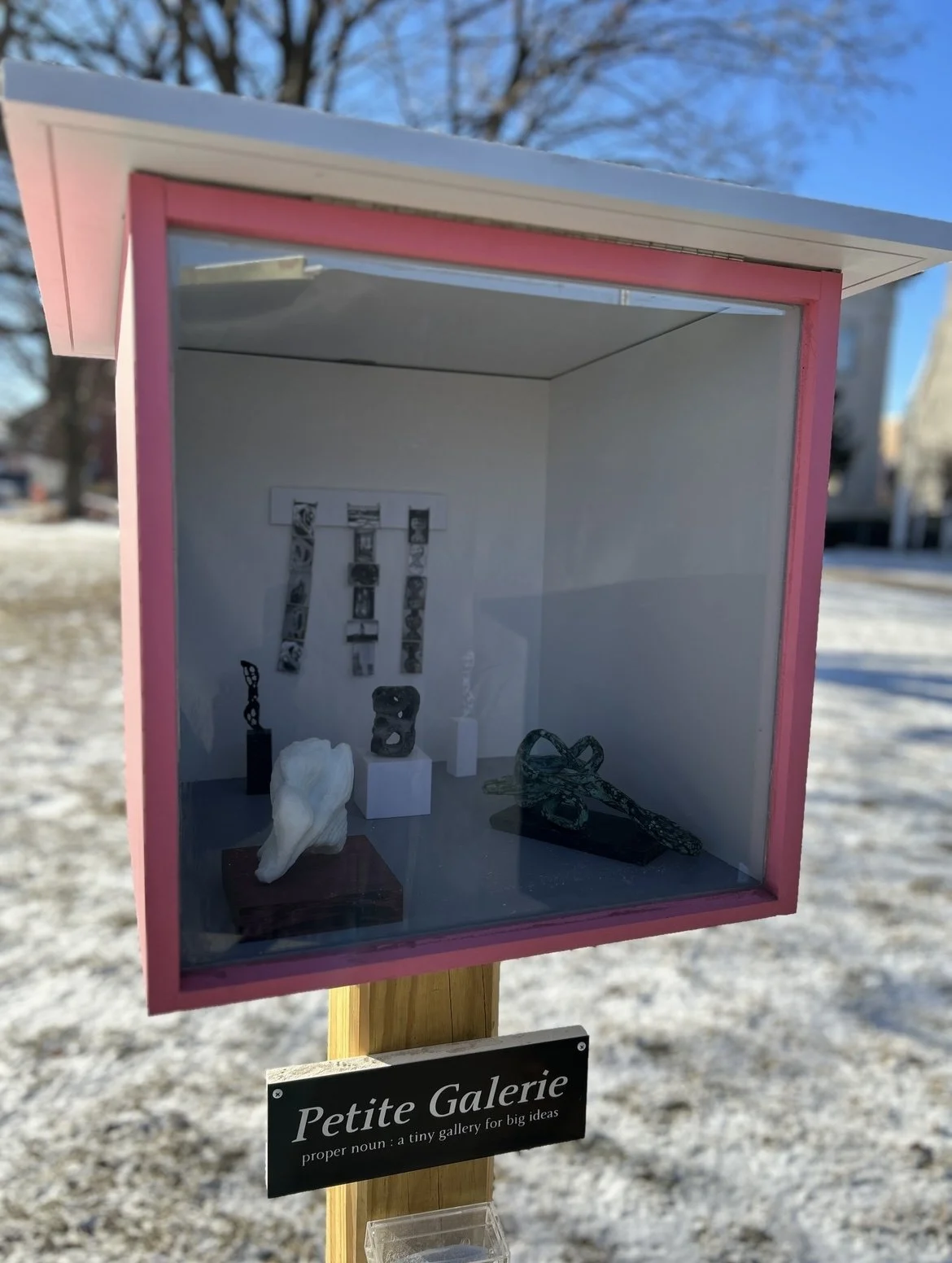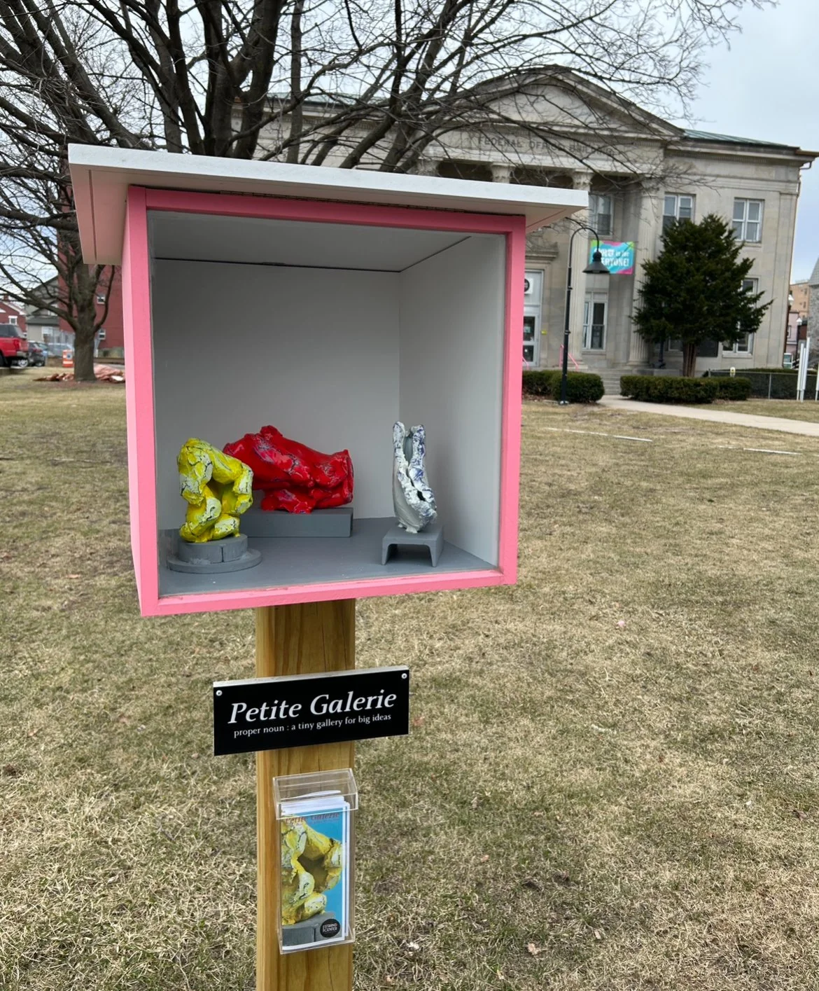 The Petite Galerie, our mini gallery that lives on the Art Center front lawn, turns one this week! The Petite Galerie was born out of a love of art and tiny objects, aiming to celebrate playfulness in the arts. We invite artists to experiment with scale. Do they treat the mini gallery as a space to showcase maquettes (small pieces used to test an idea) or are they shrinking their work to fit the scale of the gallery? Are they picturing a tiny viewer walking around the space? By showcasing art of all kinds, from local and national artists, we hope to challenge your idea of what a gallery can be or at the very least make you smile. The mini gallery brings art outside of the traditional gallery; highlighting art day or night, rain or shine.